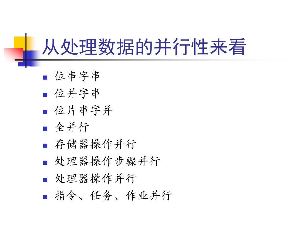 从处理数据的并行性来看 • 位串字串 • 位并字串 • 位片串字并 • 全并行 • 存储器操作并行 • 处理器操作步骤并行 • 处理器操作并行 • 指令、任务、作业并行