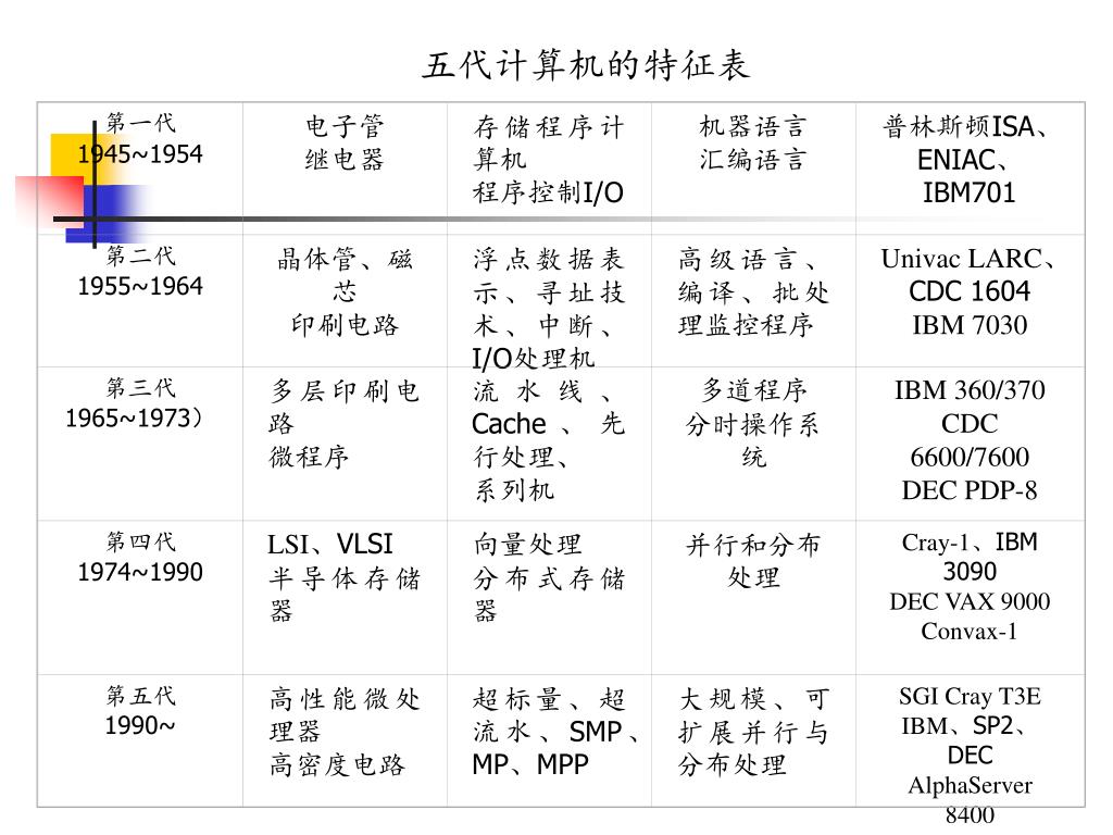 第一代 1945~1954 电子管 继电器 存储程序计算机 程序控制I/O 机器语言 汇编语言 普林斯顿ISA、ENIAC、IBM701 第二代 1955~1964 晶体管、磁芯 印刷电路 浮点数据表示、寻址技术、中断、I/O处理机 高级语言、编译、批处理监控程序 Univac LARC、CDC 1604 IBM 7030 第三代 1965~1973) 多层印刷电路 微程序 流水线、Cache、先行处理、 系列机 多道程序 分时操作系统 IBM 360/370 CDC 6600/7600 DEC PDP-8 第四代 1974~1990 LSI、VLSI 半导体存储器 向量处理 分布式存储器 并行和分布处理 Cray-1、IBM 3090 DEC VAX 9000 Convax-1 第五代 1990~ 高性能微处理器 高密度电路 超标量、超流水、SMP、MP、MPP 大规模、可扩展并行与分布处理 SGI Cray T3E IBM、SP2、DEC AlphaServer 8400 五代计算机的特征表