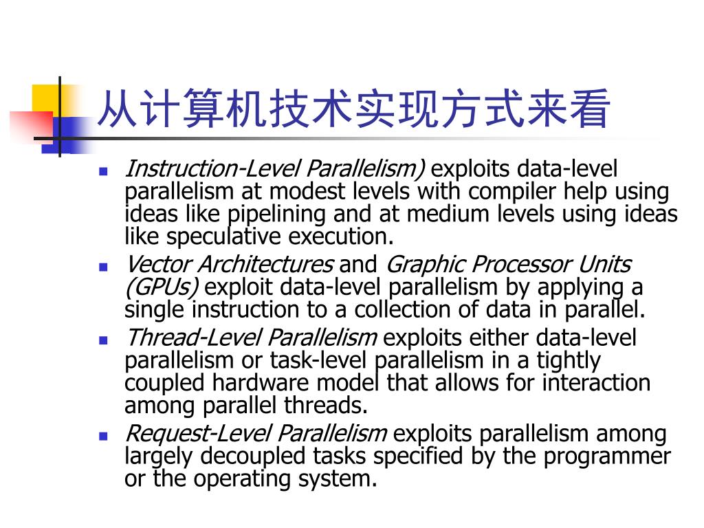 从计算机技术实现方式来看 • Instruction-Level Parallelism) exploits data-level parallelism at modest levels with compiler help using ideas like pipelining and at medium levels using ideas like speculative execution. • Vector Architectures and Graphic Processor Units (GPUs) exploit data-level parallelism by applying a single instruction to a collection of data in parallel. • Thread-Level Parallelism exploits either data-level parallelism or task-level parallelism in a tightly coupled hardware model that allows for interaction among parallel threads. • Request-Level Parallelism exploits parallelism among largely decoupled tasks specified by the programmer or the operating system.