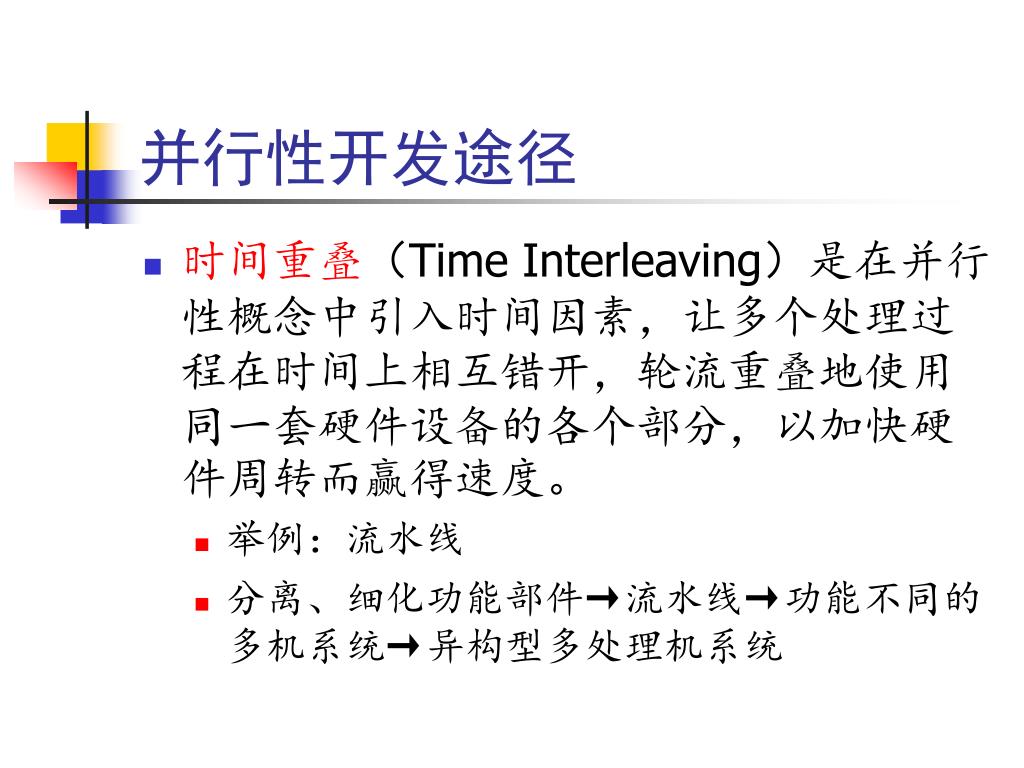 并行性开发途径 • 时间重叠(Time Interleaving)是在并行性概念中引入时间因素,让多个处理过程在时间上相互错开,轮流重叠地使用同一套硬件设备的各个部分,以加快硬件周转而赢得速度。 • 举例:流水线 • 分离、细化功能部件→流水线→功能不同的多机系统→异构型多处理机系统