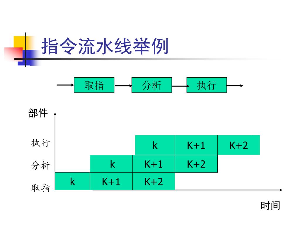 取指 分析 执行 部件 执行 k K+1 K+2 k K+1 K+2 分析 k K+1 K+2 取指 时间 指令流水线举例