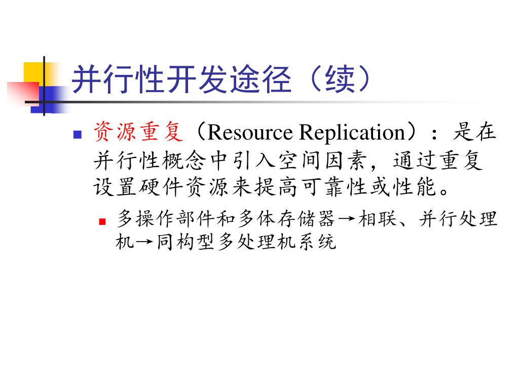并行性开发途径(续) • 资源重复(Resource Replication):是在并行性概念中引入空间因素,通过重复设置硬件资源来提高可靠性或性能。 • 多操作部件和多体存储器→相联、并行处理机→同构型多处理机系统