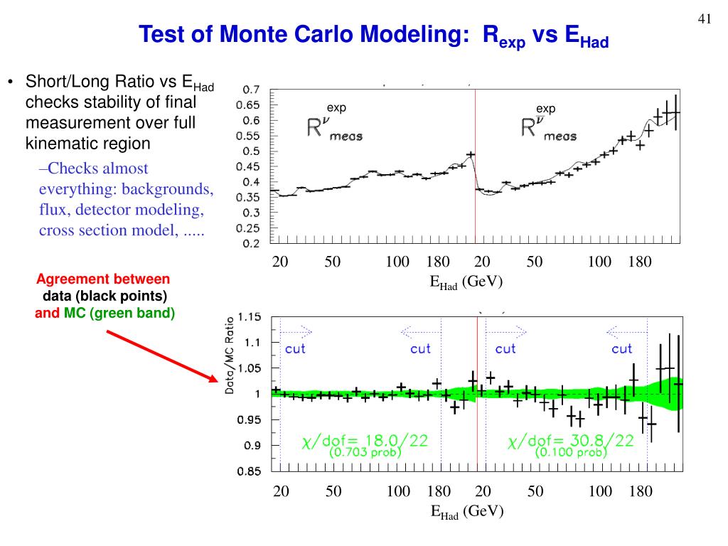 Test of Monte Carlo Modeling: Rexp vs EHad exp exp 20 50 100 180 20 50 100 180 EHad (GeV) 20 50 100 180 20 50 100 180 EHad (GeV) • Short/Long Ratio vs EHad checks stability of final measurement over full kinematic region • Checks almost everything: backgrounds, flux, detector modeling, cross section model, ..... Agreement between data (black points)and MC (green band)