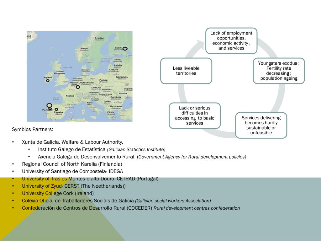 Symbios Partners: • Xunta de Galicia. Welfare & LabourAuthority. • Instituto Galego de Estatística (GalicianStatisticsInstitute) • Axencia Galega de Desenvolvemento Rural (Government Agency for Rural development policies) • Regional Council of North Karelia (Finlandia) • University of Santiago de Compostela- IDEGA • University of Tràs-os-Montes e alto Douro- CETRAD (Portugal) • University of Zyud- CERST (The Neetherlands)) • University College Cork (Ireland) • ColexioOficial de TraballadoresSociais de Galicia (Galician social workers Association) • Confederación de Centros de Desarrollo Rural (COCEDER) Rural development centres confederation