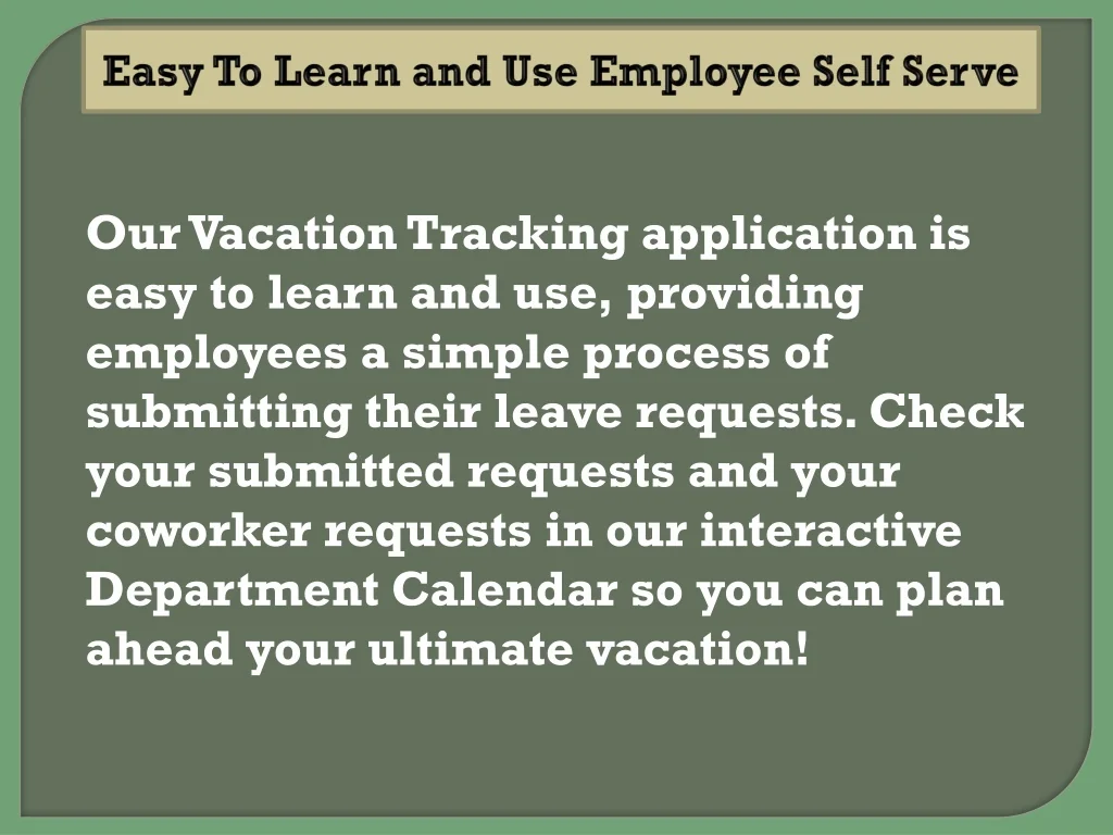 Easy To Learn and Use Employee Self Serve Our Vacation Tracking application is easy to learn and use, providing employees a simple process of submitting their leave requests. Check your submitted requests and your coworker requests in our interactive Department Calendar so you can plan ahead your ultimate vacation!
