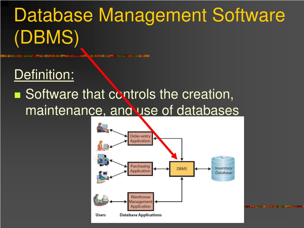 Database Management Software (DBMS) Definition: • Software that controls the creation, maintenance, and use of databases
