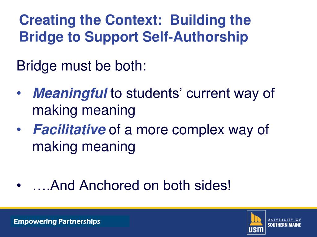 Creating the Context: Building the Bridge to Support Self-Authorship • Bridge must be both: • Meaningful to students’ current way of making meaning • Facilitative of a more complex way of making meaning • ….And Anchored on both sides! Empowering Partnerships