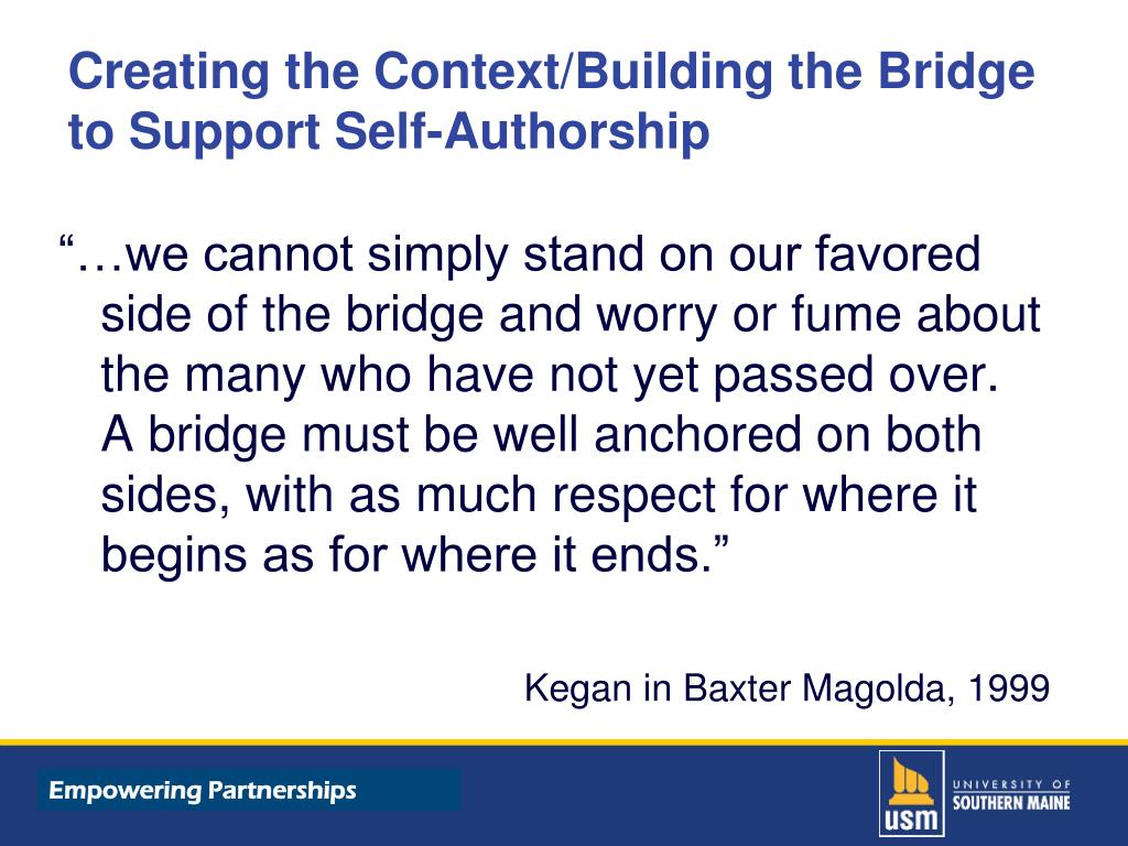 Creating the Context/Building the Bridge to Support Self-Authorship • “…we cannot simply stand on our favored side of the bridge and worry or fume about the many who have not yet passed over. A bridge must be well anchored on both sides, with as much respect for where it begins as for where it ends.” • Kegan in Baxter Magolda, 1999 Empowering Partnerships