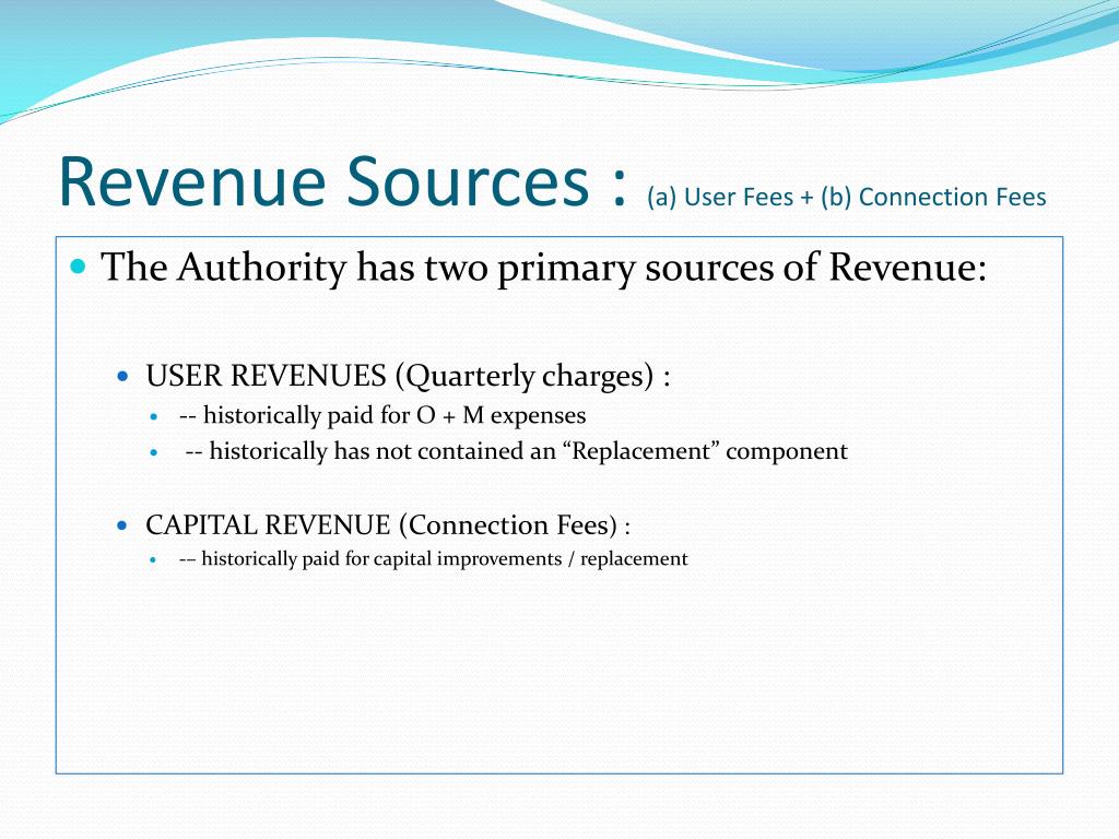 Revenue Sources : (a) User Fees + (b) Connection Fees • The Authority has two primary sources of Revenue: • USER REVENUES (Quarterly charges) : • -- historically paid for O + M expenses • -- historically has not contained an “Replacement” component • CAPITAL REVENUE (Connection Fees) : • -– historically paid for capital improvements / replacement