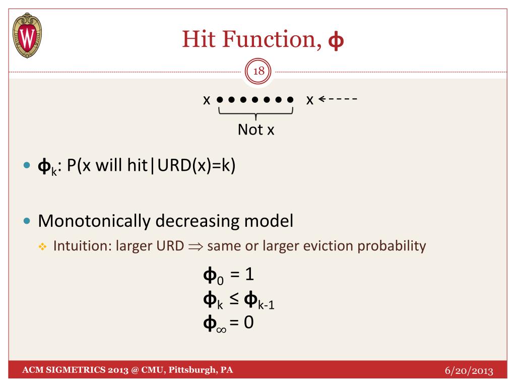 Hit Function, φ x x Not x φ0 = 1 φk ≤ φk-1 φ= 0 ∞ ACM SIGMETRICS 2013 @ CMU, Pittsburgh, PA • φk: P(x will hit|URD(x)=k) • Monotonically decreasing model • Intuition: larger URD same or larger eviction probability