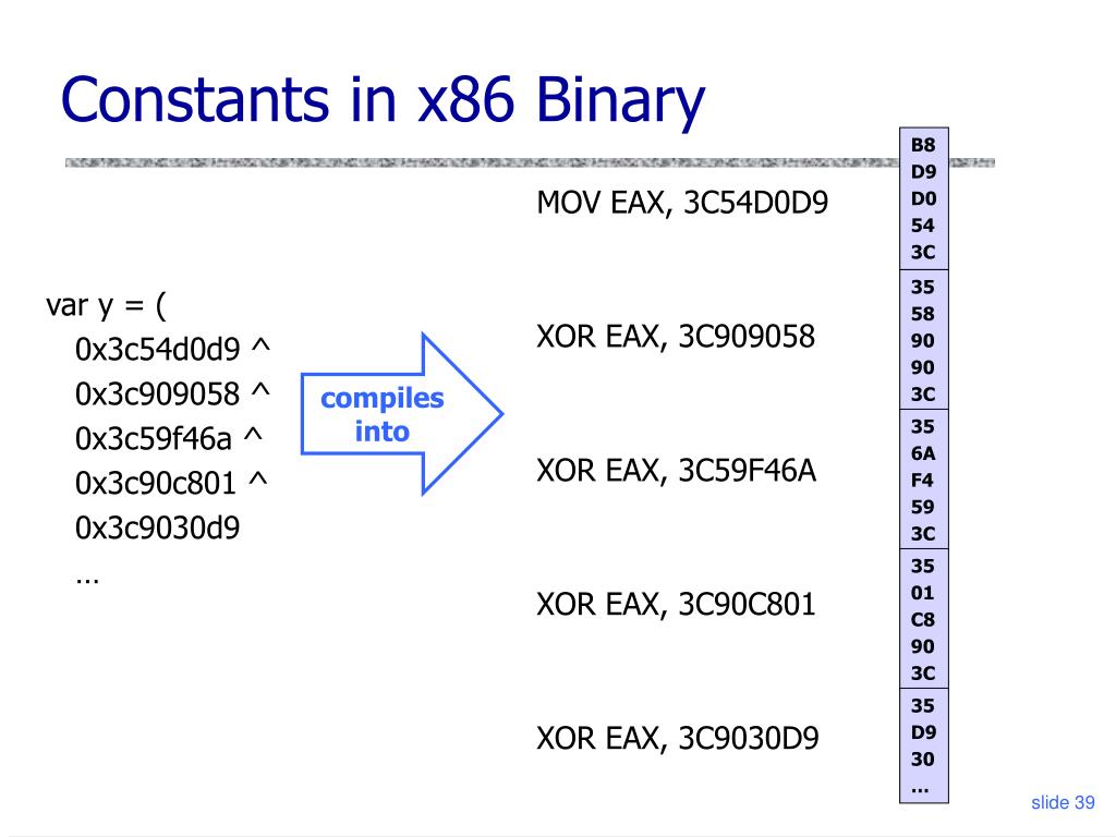 Constants in x86 Binary B8 D9 D0 54 3C MOV EAX, 3C54D0D9 XOR EAX, 3C909058 XOR EAX, 3C59F46A XOR EAX, 3C90C801 XOR EAX, 3C9030D9 35 58 90 90 3C var y = ( 0x3c54d0d9 ^ 0x3c909058 ^ 0x3c59f46a ^ 0x3c90c801 ^ 0x3c9030d9 … compiles into 35 6A F4 59 3C 35 01 C8 90 3C 35 D9 30 …