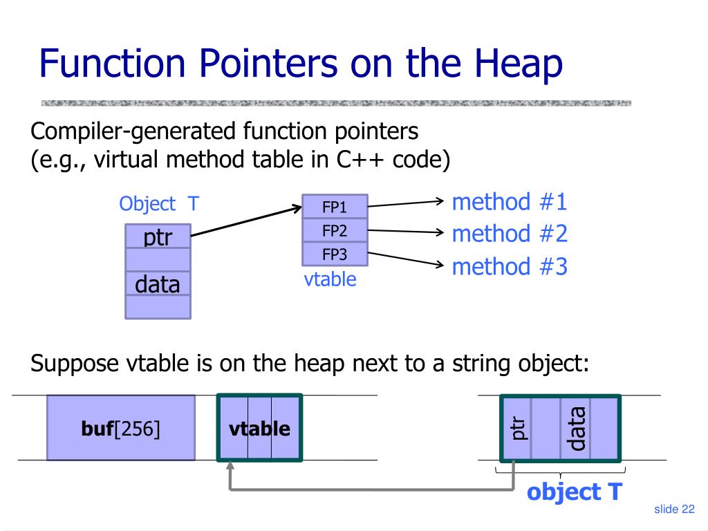 Function Pointers on the Heap Compiler-generated function pointers (e.g., virtual method table in C++ code) Suppose vtable is on the heap next to a string object: method #1 Object T FP1 method #2 FP2 ptr FP3 method #3 vtable data buf[256] vtable ptr data object T
