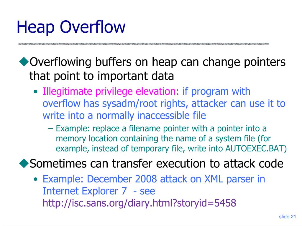 Heap Overflow • Overflowing buffers on heap can change pointers that point to important data • Illegitimate privilege elevation: if program with overflow has sysadm/root rights, attacker can use it to write into a normally inaccessible file • Example: replace a filename pointer with a pointer into a memory location containing the name of a system file (for example, instead of temporary file, write into AUTOEXEC.BAT) • Sometimes can transfer execution to attack code • Example: December 2008 attack on XML parser in Internet Explorer 7 - see http://isc.sans.org/diary.html?storyid=5458