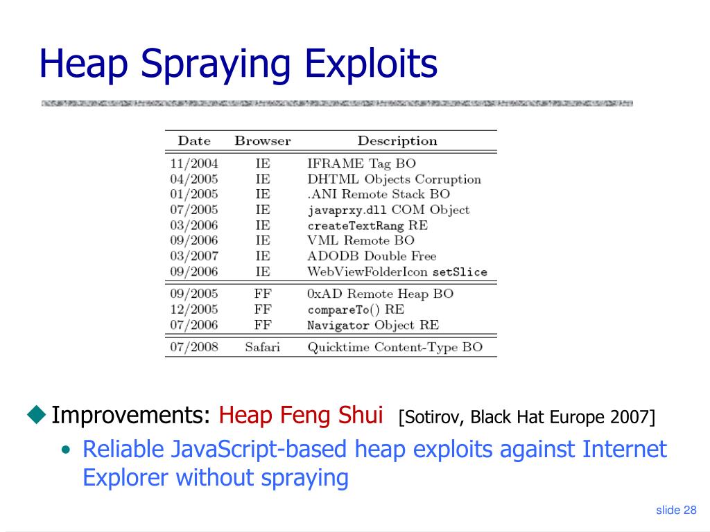 Heap Spraying Exploits • Improvements: Heap Feng Shui [Sotirov, Black Hat Europe 2007] • Reliable JavaScript-based heap exploits against Internet Explorer without spraying