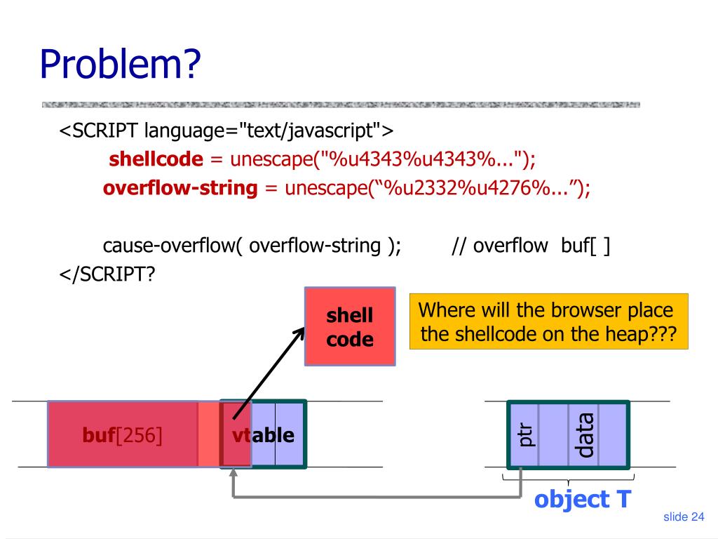 Problem? <SCRIPT language="text/javascript"> shellcode = unescape("%u4343%u4343%..."); overflow-string = unescape(“%u2332%u4276%...”); cause-overflow( overflow-string ); // overflow buf[ ] </SCRIPT? shellcode Where will the browser place the shellcode on the heap??? buf[256] vtable ptr data object T
