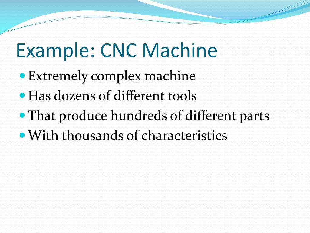 Example: CNC Machine • Extremely complex machine • Has dozens of different tools • That produce hundreds of different parts • With thousands of characteristics