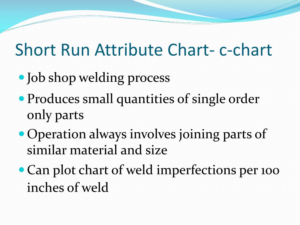 Short Run Attribute Chart- c-chart • Job shop welding process • Produces small quantities of single order only parts • Operation always involves joining parts of similar material and size • Can plot chart of weld imperfections per 100 inches of weld