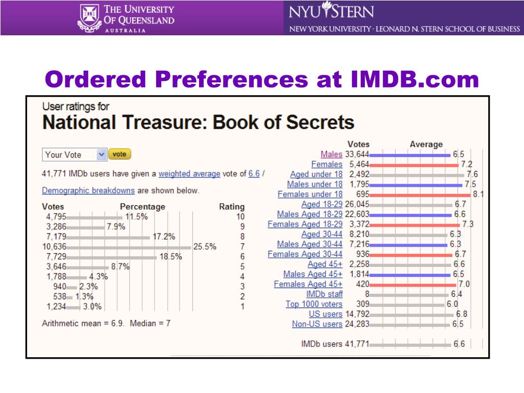 William Greene Department of Economics Stern School of Business. Topics in Microeconometrics University of Queensland Brisbane, QLD July 7-9, 2010. Ordered Choices and Count Data. Ordered Preferences at IMDB.com. Translating Movie Preferences Into a Discrete Outcome.