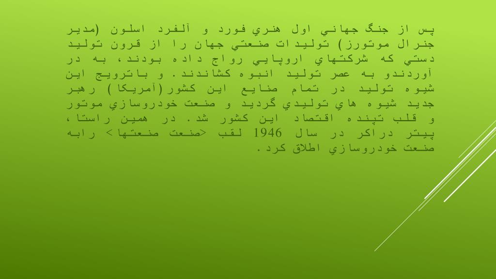 پس از جنگ جهاني اول هنري فورد و آلفرد اسلون (مدير جنرال موتورز) توليدات صنعتي جهان را از قرون توليد دستي که شرکتهاي اروپايي رواج داده بودند، به در آوردندو به عصر توليد انبوه کشاندند. و باترويج اين شيوه توليد در تمام صنايع اين کشور(آمريکا) رهبر جديد شيوه هاي توليدي گرديد و صنعت خودروسازي موتور و قلب تپنده اقتصاد اين کشور شد. در همين راستا، پيتر دراکر در سال 1946 لقب <صنعت صنعتها> رابه صنعت خودروسازي اطلاق کرد.