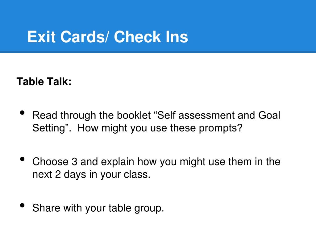 Exit Cards/ Check Ins Table Talk: • Read through the booklet “Self assessment and Goal Setting”. How might you use these prompts? • Choose 3 and explain how you might use them in the next 2 days in your class. • Share with your table group.