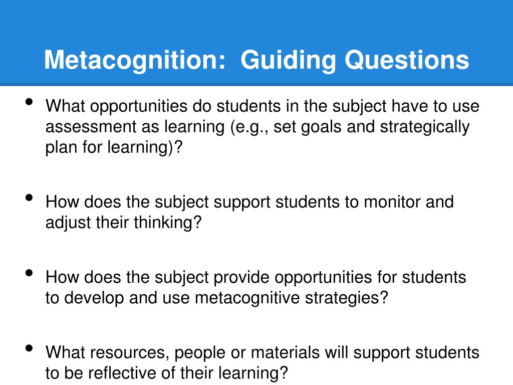 Metacognition: Guiding Questions • What opportunities do students in the subject have to use assessment as learning (e.g., set goals and strategically plan for learning)? • How does the subject support students to monitor and adjust their thinking? • How does the subject provide opportunities for students to develop and use metacognitive strategies? • What resources, people or materials will support students to be reflective of their learning?