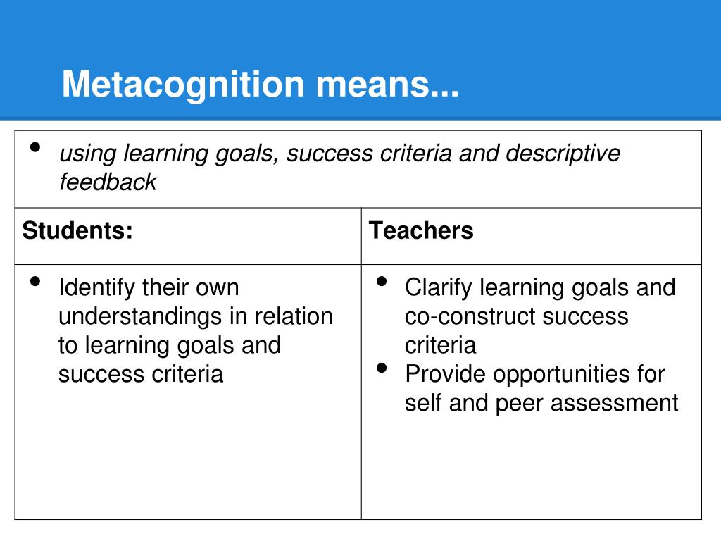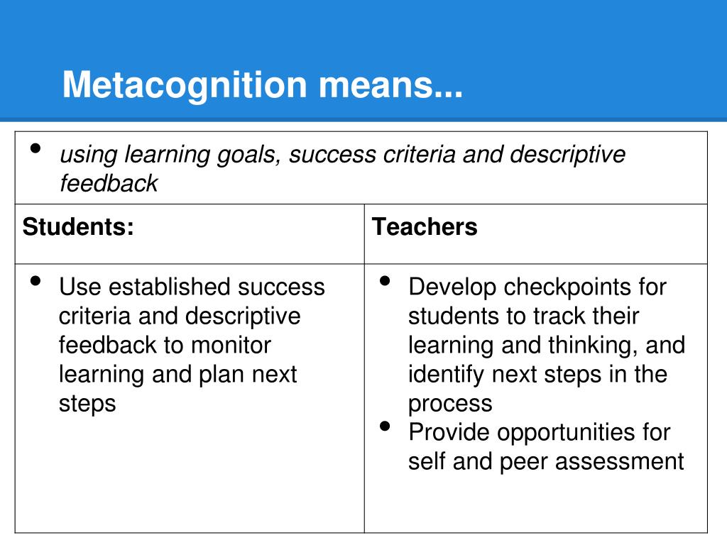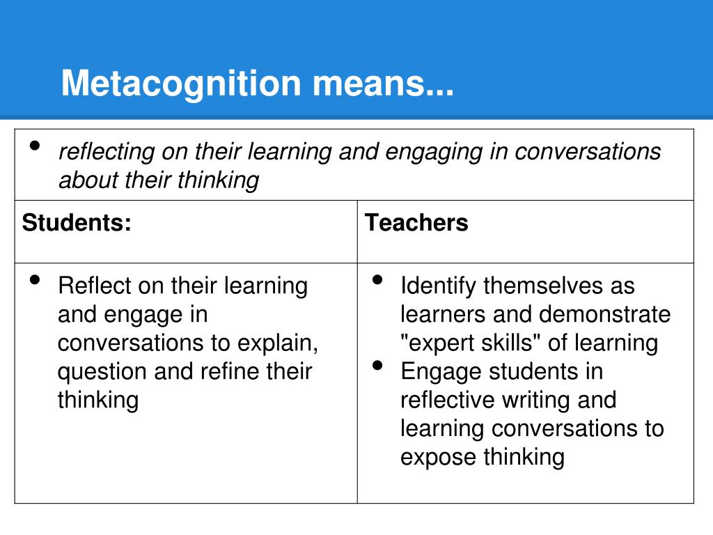 Why teach it Metacognition contributes to successful learning, and moves students toward independence, interdependence, and self-efficacy. Through metacognitive strategies, students learn to master information and solve problems more easily. (Brock et al. 2005; Scruggs, 1985) (ALG 25)
