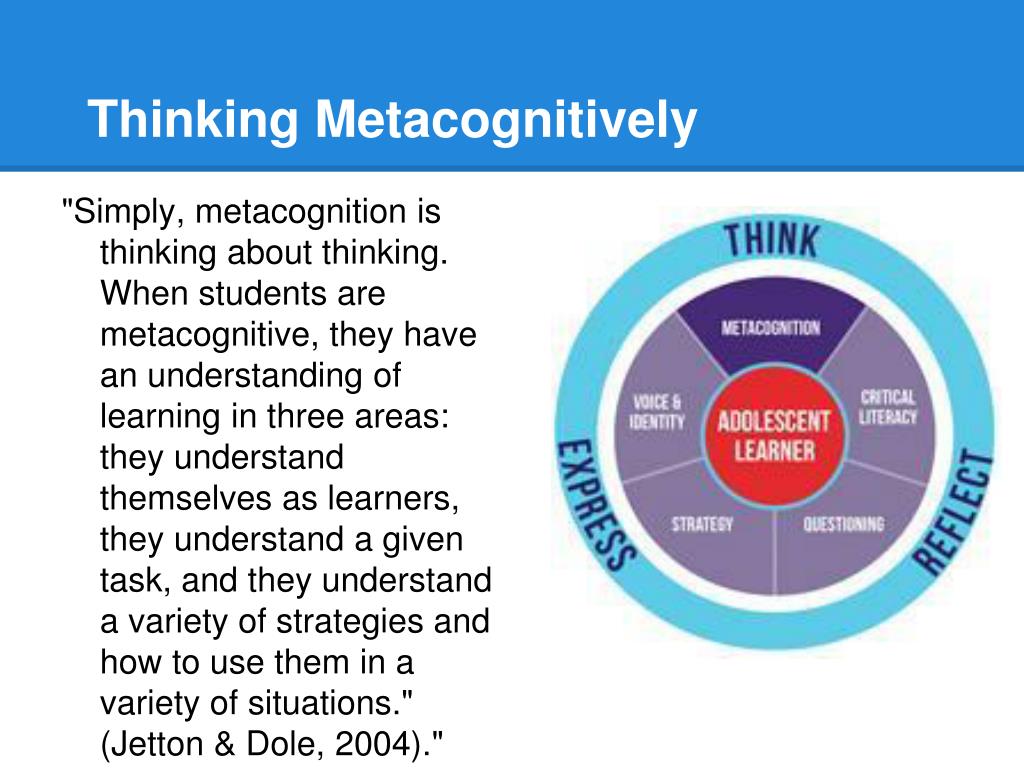 Thinking Metacognitively "Simply, metacognition is thinking about thinking. When students are metacognitive, they have an understanding of learning in three areas: they understand themselves as learners, they understand a given task, and they understand a variety of strategies and how to use them in a variety of situations." (Jetton & Dole, 2004)." (ALG 24)