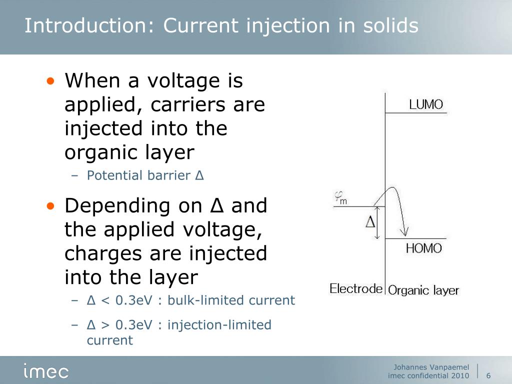 Introduction: Current injection in solids • When a voltage is applied, carriers are injected into the organic layer • Potential barrier Δ • Depending on Δ and the applied voltage, charges are injected into the layer • Δ < 0.3eV : bulk-limited current • Δ > 0.3eV : injection-limited current Johannes Vanpaemel imec confidential 2010