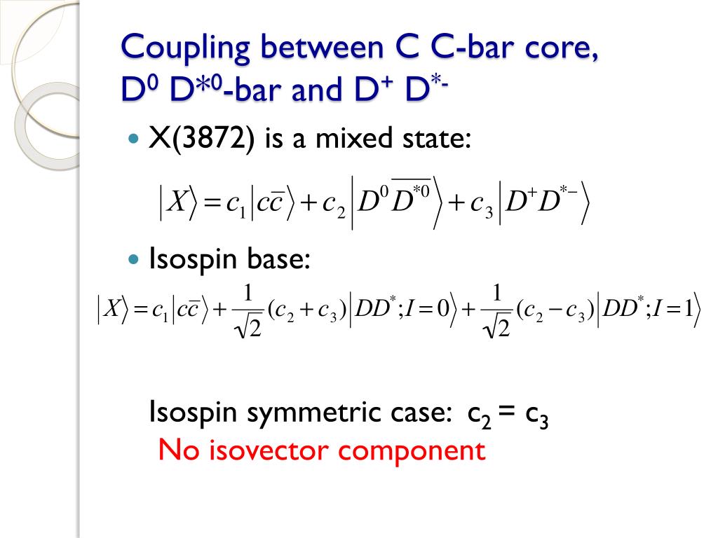 Coupling between C C-bar core, D0 D*0-bar and D+ D*- • X(3872) is a mixed state: • Isospin base:Isospin symmetric case: c2 = c3 No isovector component