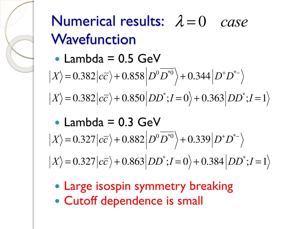 Numerical results: Wavefunction • Lambda = 0.5 GeV • Lambda = 0.3 GeV • Large isospin symmetry breaking • Cutoff dependence is small