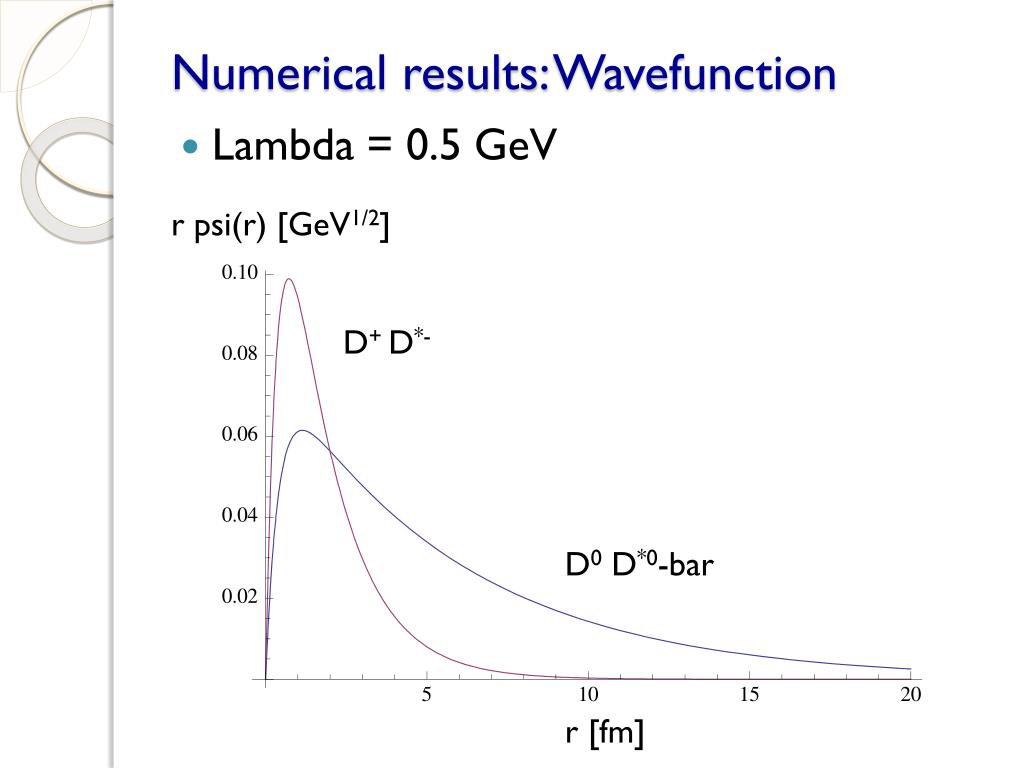 Numerical results: Wavefunction • Lambda = 0.5 GeV rpsi(r) [GeV1/2] D+ D*- D0 D*0-bar r [fm]