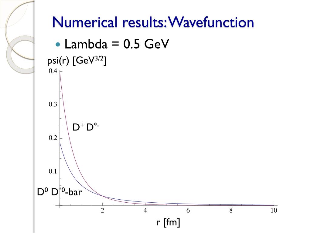 Numerical results: Wavefunction • Lambda = 0.5 GeV psi(r) [GeV3/2] D+ D*- D0 D*0-bar r [fm]