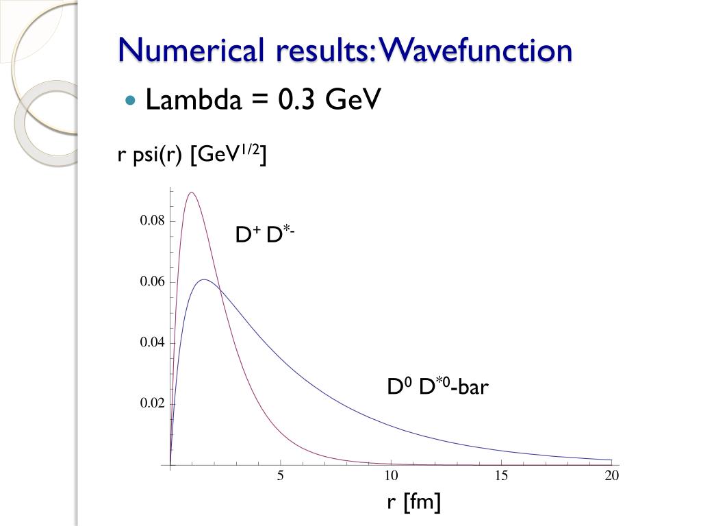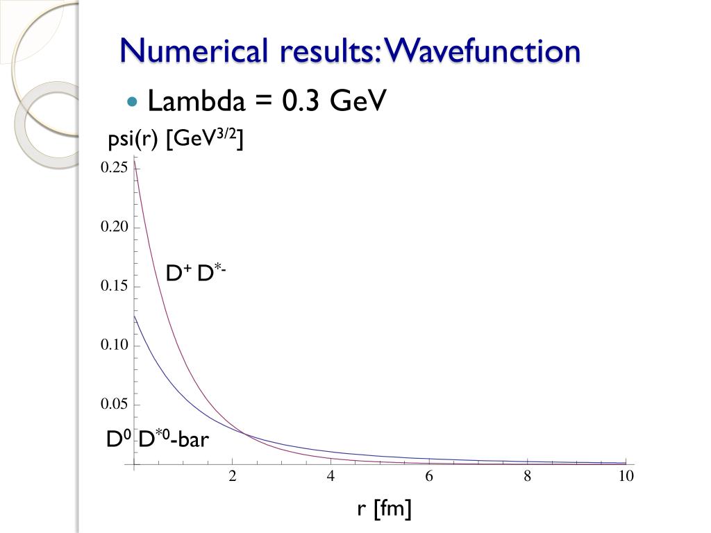 Numerical results: Wavefunction • Lambda = 0.3 GeV psi(r) [GeV3/2] D+ D*- D0 D*0-bar r [fm]