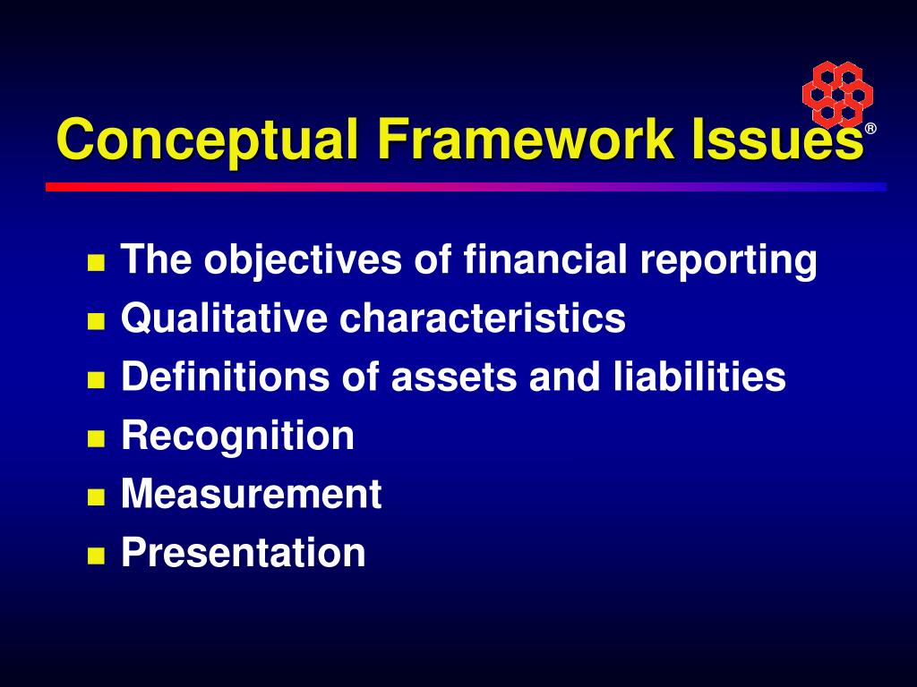 Conceptual Framework Issues • The objectives of financial reporting • Qualitative characteristics • Definitions of assets and liabilities • Recognition • Measurement • Presentation