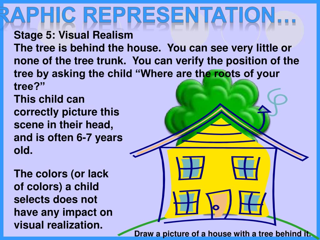 Graphic representation… • Stage 3: Failed Realism Draw a picture of a house with a tree behind it. -The tree is NOT behind the house; it may be beside the house, juxtaposed on top of the house, or tucked halfway behind the house; often drawn by a 4-5 year old