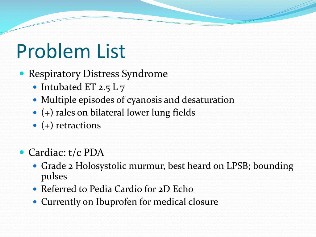 Problem List • Respiratory Distress Syndrome • Intubated ET 2.5 L 7 • Multiple episodes of cyanosis and desaturation • (+) rales on bilateral lower lung fields • (+) retractions • Cardiac: t/c PDA • Grade 2 Holosystolic murmur, best heard on LPSB; bounding pulses • Referred to Pedia Cardio for 2D Echo • Currently on Ibuprofen for medical closure