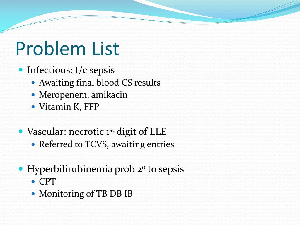 Problem List • Infectious: t/c sepsis • Awaiting final blood CS results • Meropenem, amikacin • Vitamin K, FFP • Vascular: necrotic 1st digit of LLE • Referred to TCVS, awaiting entries • Hyperbilirubinemiaprob 2o to sepsis • CPT • Monitoring of TB DB IB