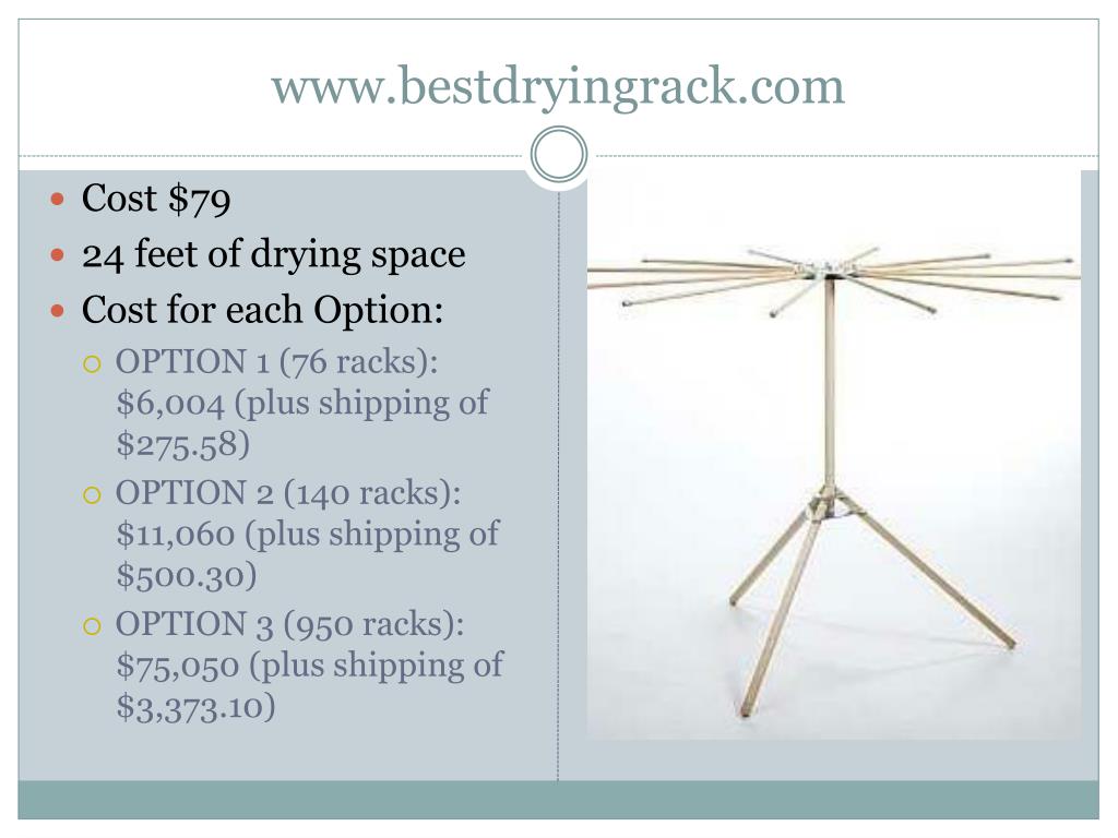 www.bestdryingrack.com • Cost $79 • 24 feet of drying space • Cost for each Option: • OPTION 1 (76 racks): $6,004 (plus shipping of $275.58) • OPTION 2 (140 racks): $11,060 (plus shipping of $500.30) • OPTION 3 (950 racks): $75,050 (plus shipping of $3,373.10)