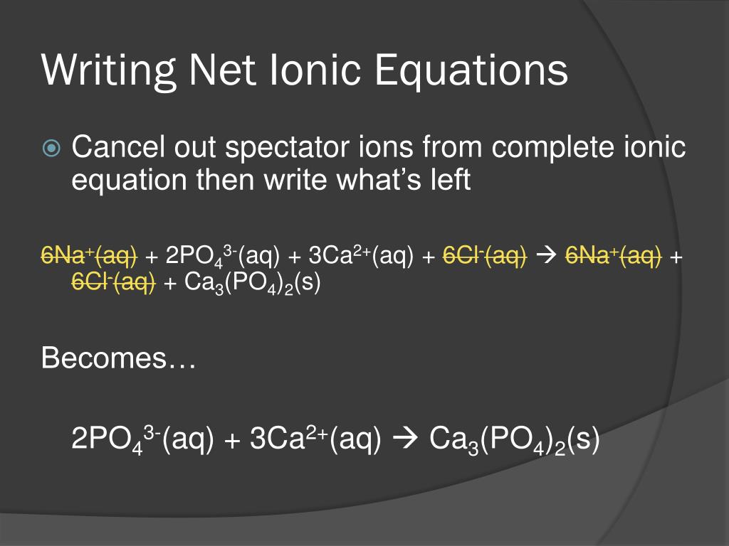 Writing Complete Ionic Equations Example: 2Na3PO4(aq) + 3CaCl2(aq) 6NaCl(aq) + Ca3(PO4)2(s) Becomes… 6Na+(aq) + 2PO43-(aq) + 3Ca2+(aq) + 6Cl-(aq) 6Na+(aq) + 6Cl-(aq) + Ca3(PO4)2(s)