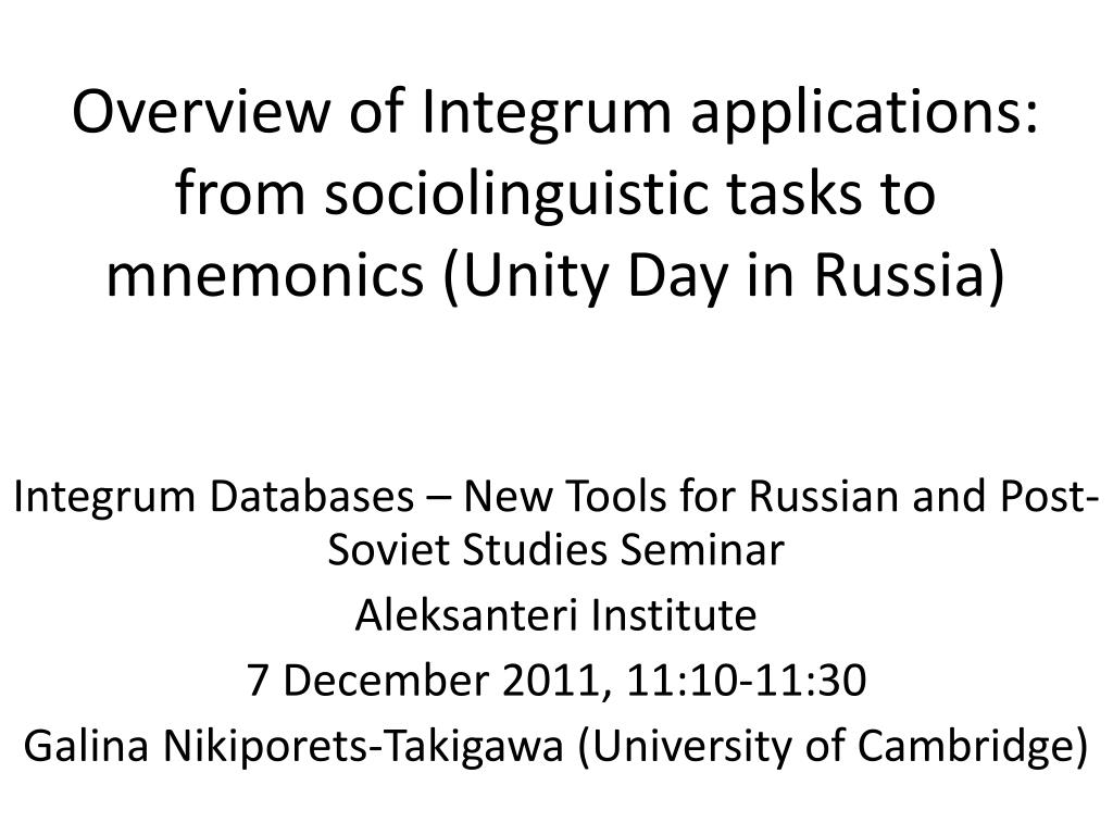 Overview of Integrum applications: from sociolinguistic tasks to mnemonics (Unity Day in Russia). Integrum Databases – New Tools for Russian and Post-Soviet Studies Seminar Aleksanteri Institute 7 December 2011, 11:10-11:30 Galina Nikiporets-Takigawa (University of Cambridge).