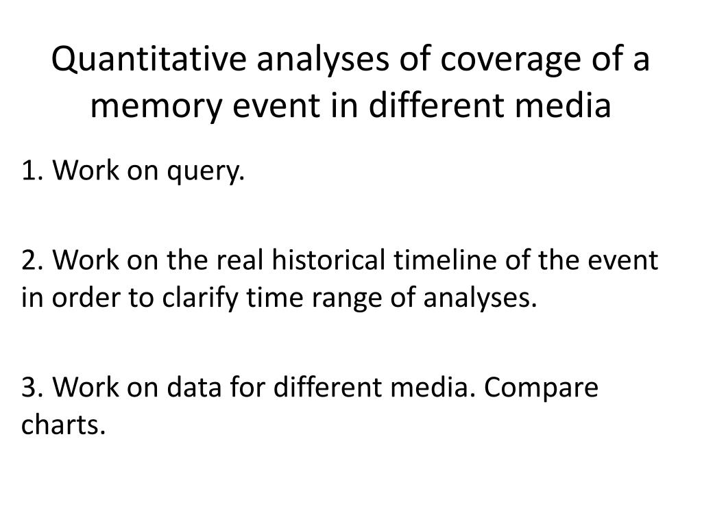 Quantitative analyses of coverage of a memory event in different media 1. Work on query. 2. Work on the real historical timeline of the event in order to clarify time range of analyses. 3. Work on data for different media. Compare charts.
