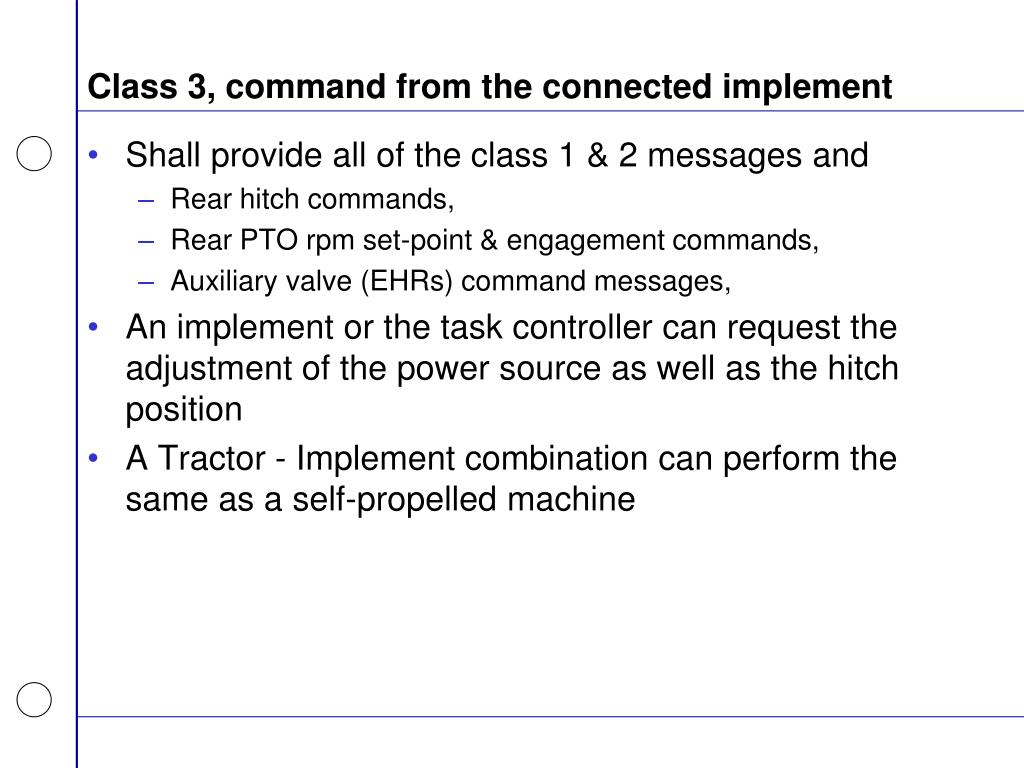 Class 3, command from the connected implement • Shall provide all of the class 1 & 2 messages and • Rear hitch commands, • Rear PTO rpm set-point & engagement commands, • Auxiliary valve (EHRs) command messages, • An implement or the task controller can request the adjustment of the power source as well as the hitch position • A Tractor - Implement combination can perform the same as a self-propelled machine