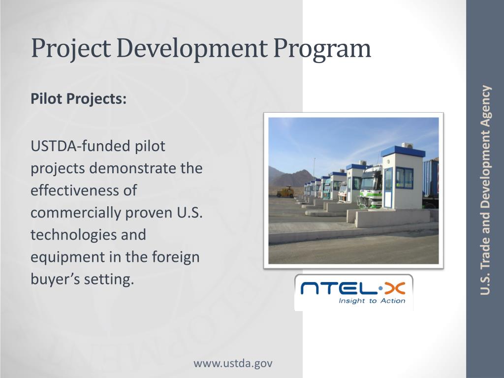 Project Development Program Pilot Projects: USTDA-funded pilot projects demonstrate the effectiveness of commercially proven U.S. technologies and equipment in the foreign buyer’s setting.