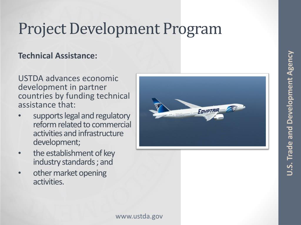 Project Development Program Technical Assistance: USTDA advances economic development in partner countries by funding technical assistance that: • supports legal and regulatory reform related to commercial activities and infrastructure development; • the establishment of key industry standards ; and • other market opening activities.