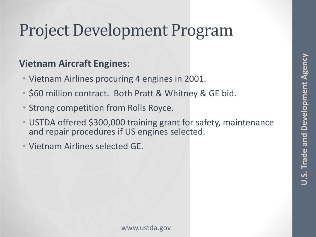 Project Development Program • Vietnam Aircraft Engines: • Vietnam Airlines procuring 4 engines in 2001. • $60 million contract. Both Pratt & Whitney & GE bid. • Strong competition from Rolls Royce. • USTDA offered $300,000 training grant for safety, maintenance and repair procedures if US engines selected. • Vietnam Airlines selected GE.