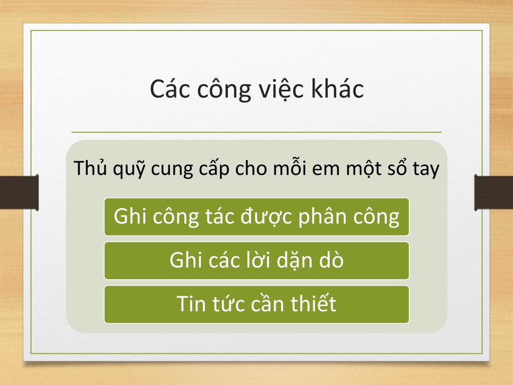 1. Chuẩnbị • Soạnchươngtrìnhhọp, chọnbàiThủbảnlàmsáchthiêngliêng, chuẩnbịsẵncáccâuhỏigợi ý đểhọcThủbản. Tìmsẵncôngtácphùhợpvớitừngđộtuổi. Chọnđịađiểmsinhhoạtsaugiờhọpnếucóthể. Soạnchươngtrìnhsinhhoạttậpthể, tấtcảđềuđượcchuẩnbịkỹvàchuđáotrướckhivàobuổihọp.