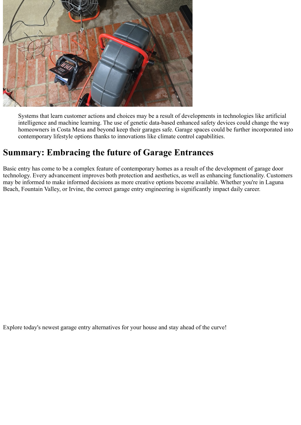 Systems that learn customer actions and choices may be a result of developments in technologies like artificial intelligence and machine learning. The use of genetic data-based enhanced safety devices could change the way homeowners in Costa Mesa and beyond keep their garages safe. Garage spaces could be further incorporated into contemporary lifestyle options thanks to innovations like climate control capabilities. Summary: Embracing the future of Garage Entrances Basic entry has come to be a complex feature of contemporary homes as a result of the development of garage door technology. Every advancement improves both protection and aesthetics, as well as enhancing functionality. Customers may be informed to make informed decisions as more creative options become available. Whether you're in Laguna Beach, Fountain Valley, or Irvine, the correct garage entry engineering is significantly impact daily career. Explore today's newest garage entry alternatives for your house and stay ahead of the curve!