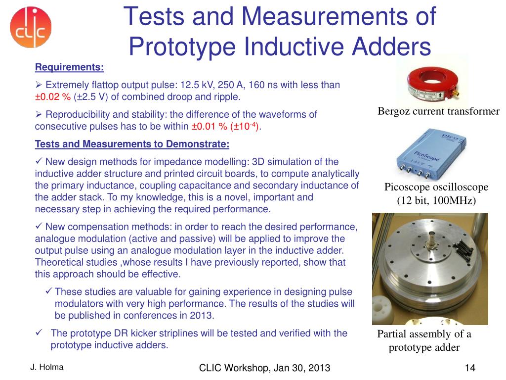 Tests and Measurements of Prototype Inductive Adders • Requirements: • Extremely flattop output pulse: 12.5 kV, 250 A, 160 ns with less than ±0.02 % (±2.5 V) of combined droop and ripple. • Reproducibility and stability: the difference of the waveforms of consecutive pulses has to be within ±0.01 % (±10-4). • Tests and Measurements to Demonstrate: • New design methods for impedance modelling: 3D simulation of the inductive adder structure and printed circuit boards, to compute analytically the primary inductance, coupling capacitance and secondary inductance of the adder stack. To my knowledge, this is a novel, important and necessary step in achieving the required performance. • New compensation methods: in order to reach the desired performance, analogue modulation (active and passive) will be applied to improve the output pulse using an analogue modulation layer in the inductive adder. Theoretical studies ,whose results I have previously reported, show that this approach should be effective. • These studies are valuable for gaining experience in designing pulse modulators with very high performance. The results of the studies will be published in conferences in 2013. • The prototype DR kicker striplines will be tested and verified with the prototype inductive adders. • Se Bergoz current transformer Picoscope oscilloscope (12 bit, 100MHz) Partial assembly of a prototype adder CLIC Workshop, Jan 30, 2013