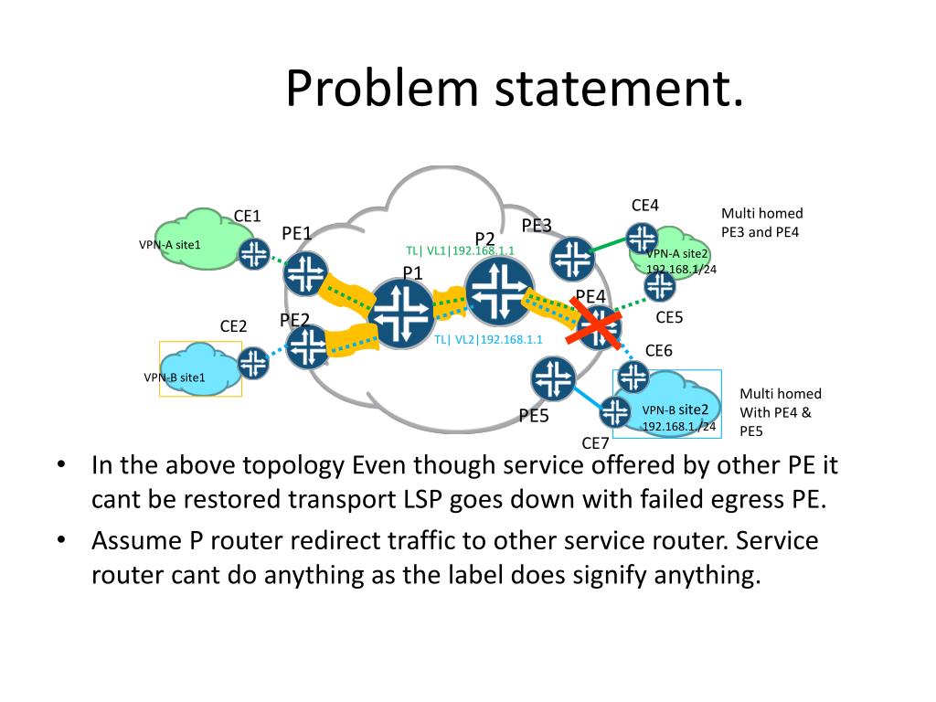 Problem statement. • In the above topology Even though service offered by other PE it cant be restored transport LSP goes down with failed egress PE. • Assume P router redirect traffic to other service router. Service router cant do anything as the label does signify anything. CE4 Multi homed PE3 and PE4 CE1 PE3 PE1 P2 VPN-A site1 TL| VL1|192.168.1.1 VPN-A site2 192.168.1/24 P1 PE4 CE5 PE2 CE2 TL| VL2|192.168.1.1 CE6 VPN-B site1 Multi homed With PE4 & PE5 VPN-B site2 192.168.1./24 PE5 CE7