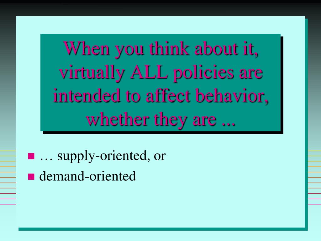 When you think about it, virtually ALL policies are intended to affect behavior, whether they are ... • … supply-oriented, or • demand-oriented
